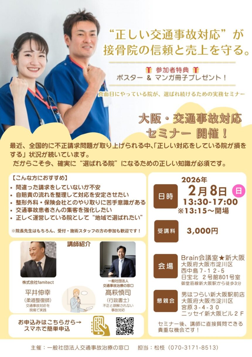 2026年2月8日(日)、大阪にて交通事故患者受け入れに特化した接骨院様向けセミナーを開催いたします。